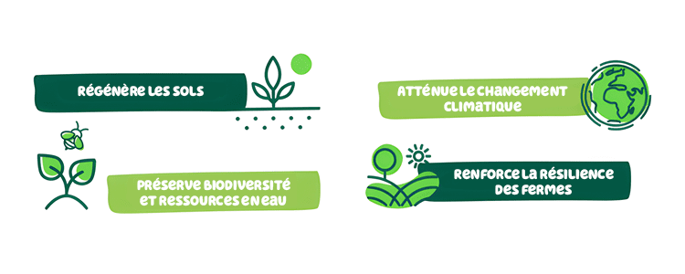Cette approche globale ambitionne six objectifs principaux : préserver la santé des sols, encourager la séquestration du carbone et réduire les émissions, améliorer la biodiversité, accroître la qualité de l’eau tout en réduisant sa consommation, réduire l’utilisation d’intrants et veiller à ce que les exploitations soient économiquement viables.