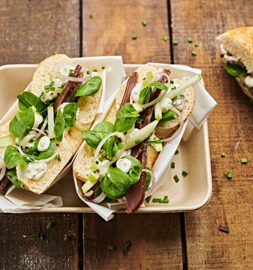 Le Bagel au Thon Fumé avec Boursin® Cuisine Ail & Fines Herbes est une version délicieuse et crémeuse d’un classique. Le thon fumé est associé à une généreuse couche de Boursin® Cuisine Ail & Fines Herbes, une pâte à tartiner onctueuse et parfumée à l’ail et aux herbes. Le tout est enveloppé dans un bagel frais, légèrement grillé, offrant une combinaison parfaite de saveurs savoureuses et fraîches. Un choix idéal pour un repas rapide, mais raffiné.