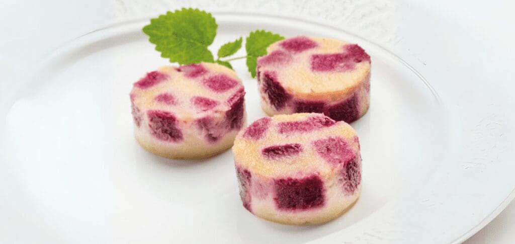 Le Calfoutis aux Cerises Texture Manger-Mains avec La Vache qui rit® Formule Plus est une version ludique et crémeuse de ce dessert classique. Ce calfoutis, cuit à la perfection pour offrir une texture moelleuse et facile à manger, est enrichi avec La Vache qui rit® Formule Plus, une pâte à tartiner onctueuse qui apporte une douceur supplémentaire. L’alliance des cerises juteuses et du fromage crémeux crée une expérience gustative irrésistible, parfaite pour une pause gourmande.