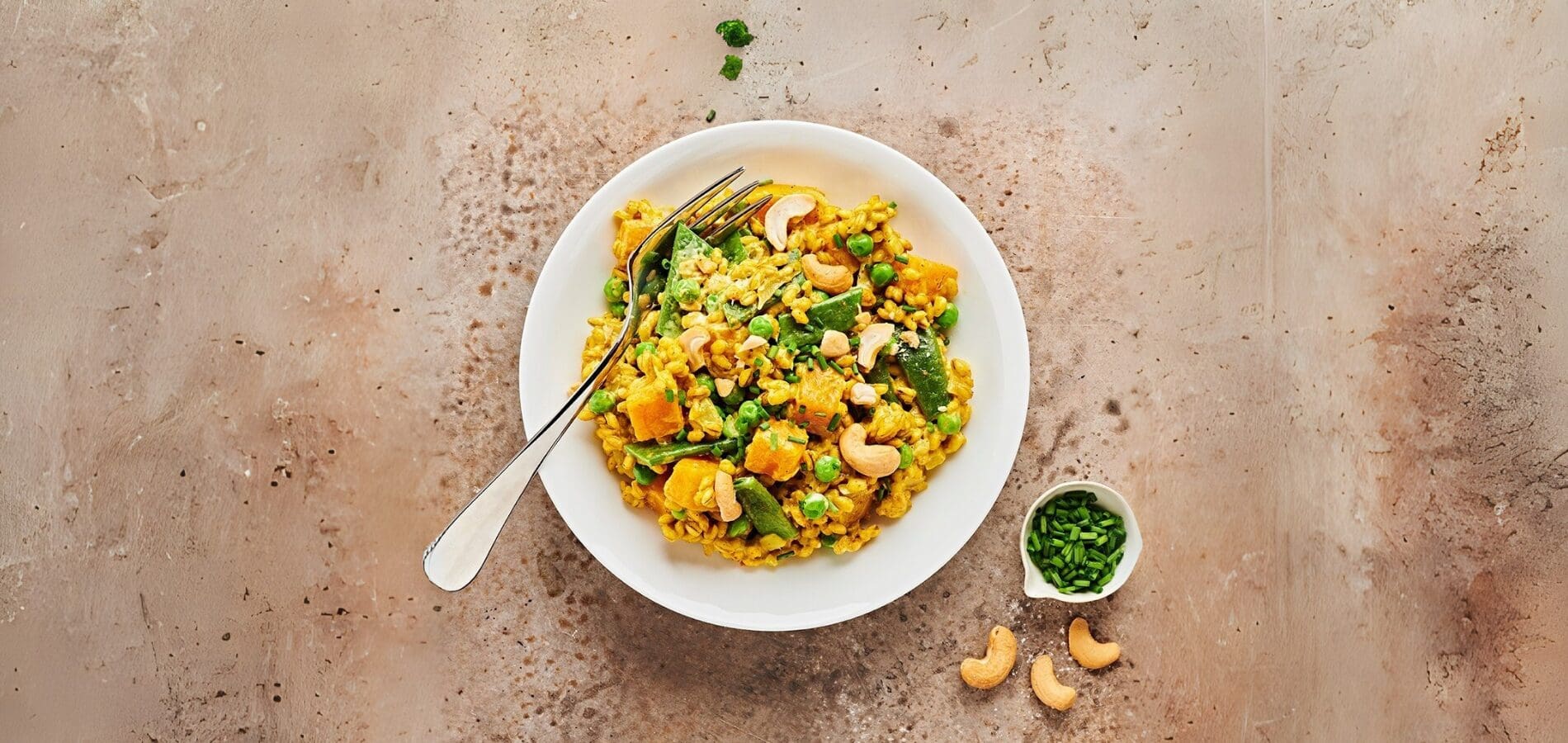 Le Curry d’Orge Perlé et Butternut avec La Vache qui rit® Bio est un plat végétarien réconfortant et riche en saveurs. L’orge perlé, tendre et nourrissant, se marie parfaitement avec la douceur de la courge butternut et l’épice du curry. La Vache qui rit® Bio Terrine, une pâte à tartiner bio onctueuse, apporte une touche crémeuse et naturelle qui équilibre délicieusement les saveurs. Un plat équilibré et savoureux, idéal pour un dîner léger et chaleureux.