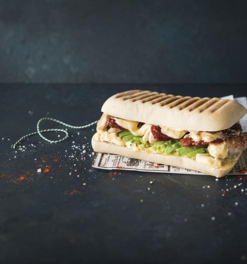 Le Panini Poulet et Fromage avec Sauce La Vache qui rit® Professionnel saveur emmental est un classique revisité, alliant la tendreté du poulet grillé à la douceur onctueuse de la sauce. Le pain légèrement croustillant renferme une garniture généreuse de poulet juteux et de fromage fondant, rehaussée par la saveur délicate de La Vache qui rit® Originale Professionnel. Un sandwich chaud et gourmand, parfait pour une pause déjeuner pleine de saveurs.