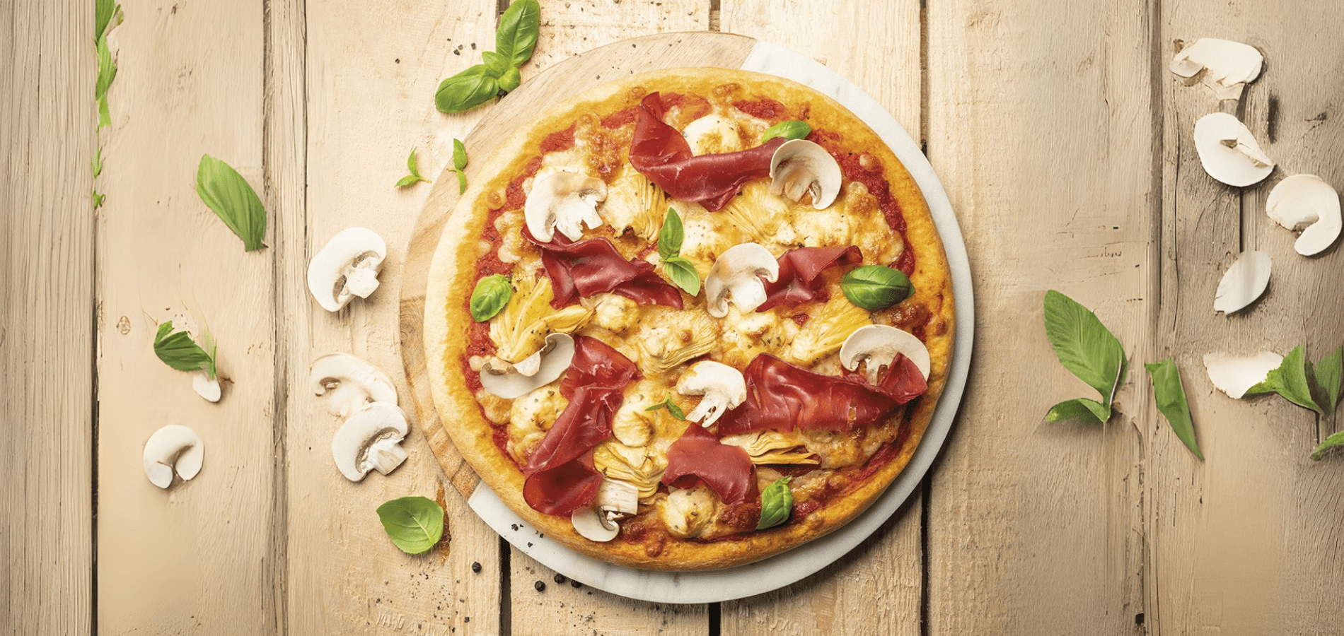 7. Une fois la pizza cuite, la sortir du four et répartir joliment sur le dessus les copeaux de champignons de Paris et quelques feuilles de basilic.